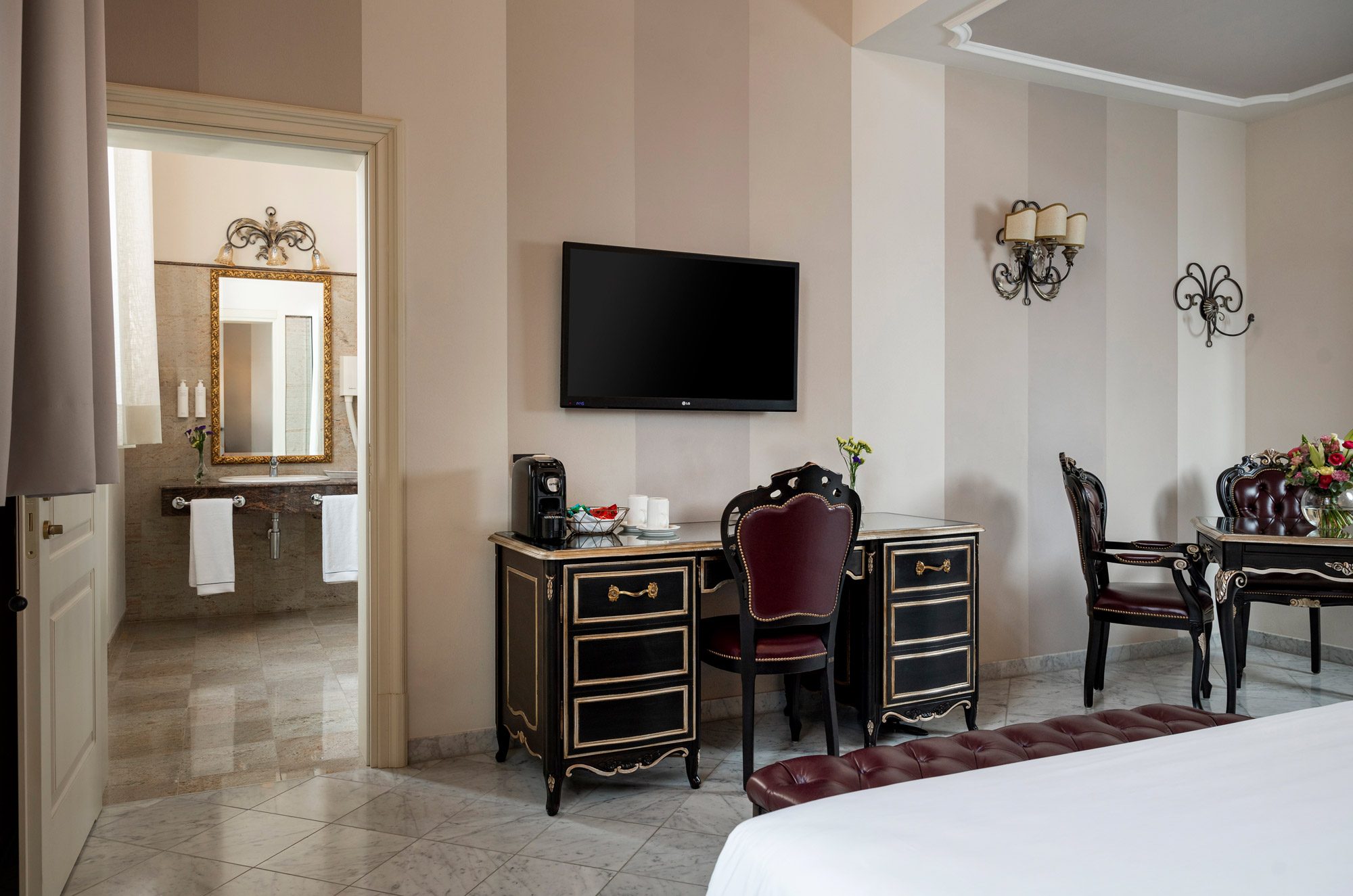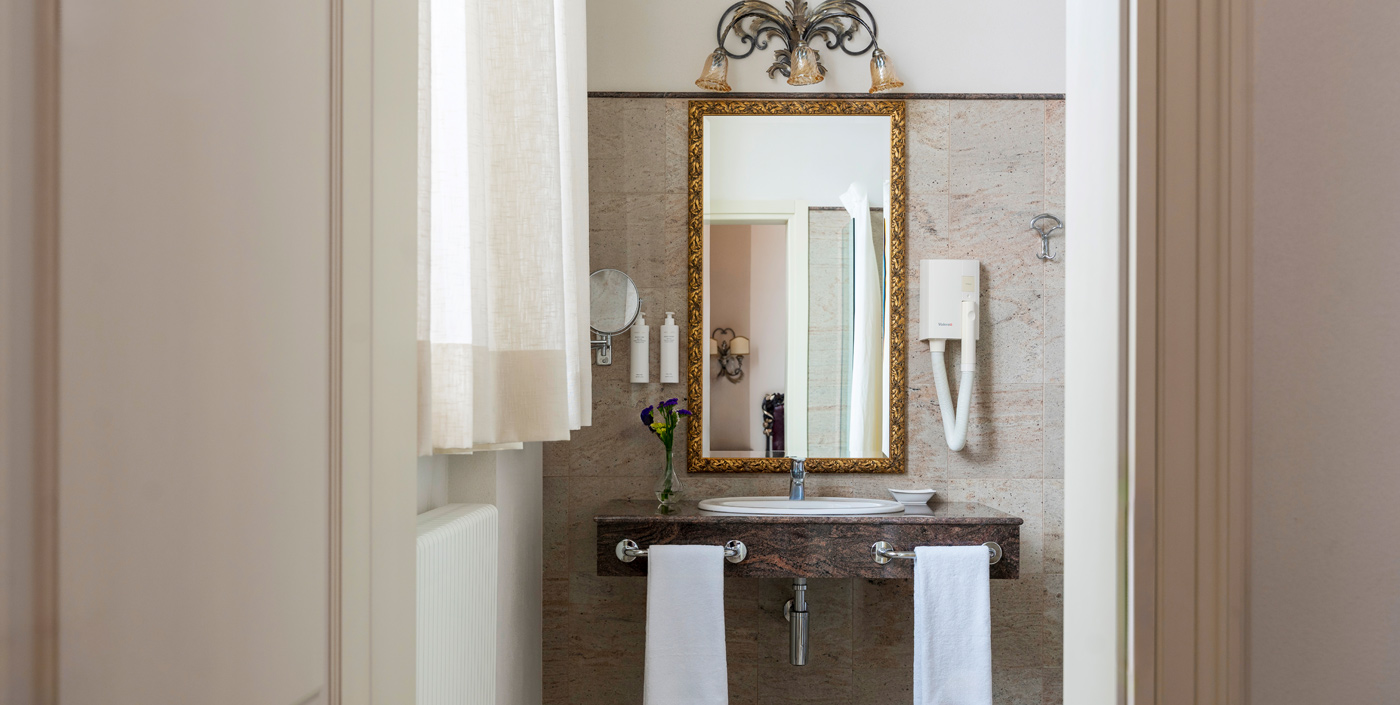 From 18 to 20 square metres, tranquillity, attention to detail and ambience, a comfortable queen-size bed, fine furnishings embraced by refined marble, the gold of mirrors and chandeliers.