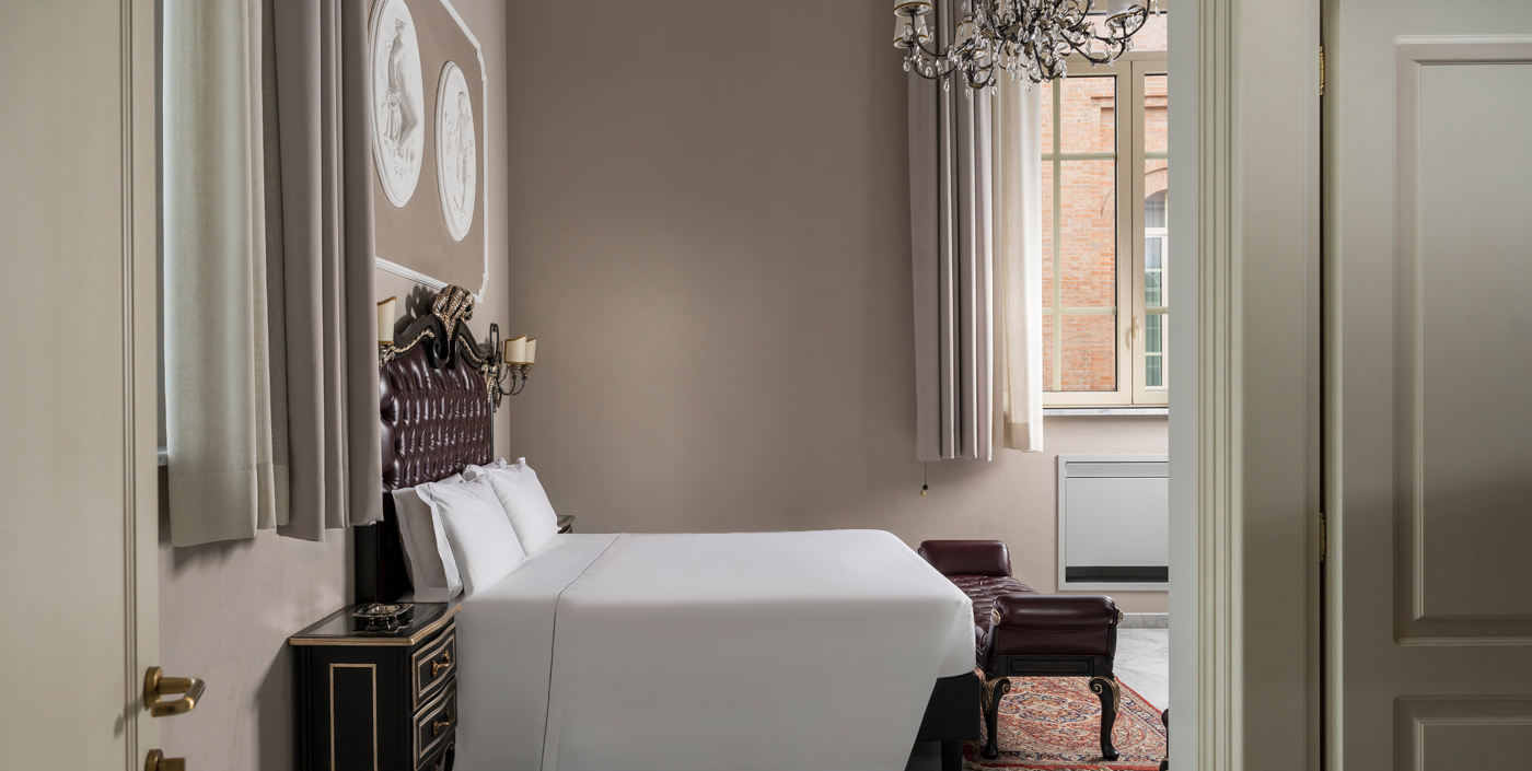 From 32 to 36 square metres, these rooms overlooking the park or the city center are the perfect combination of style, comfort and spaciousness. Queen-size bed, fine wooden furniture, workstation, bathroom in Carrara marble.